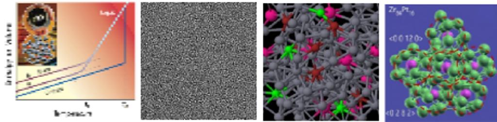 图1 液态浇铸获得的非晶态合金与其内部结构。左一:液体快速冷却时跃过晶化而成为玻璃态。其外观如通常合金,但内部无晶体结构:高分辨电镜照片如左二所示。第一性原理分子动力学模拟得到的内部局域原子构型如右侧两幅图所示。其中原子间绘制的短线并非表示定向键合,而是用于暗示原子与其最近邻原子之间的直接接触关系,构成配位多面体。不同颜色的球代表不同的化学元素,右图中粉色为Pt、绿色为Zr。该非晶合金的结构看似无序,而虚线勾画的模体标示了该结构中的代表性基元。